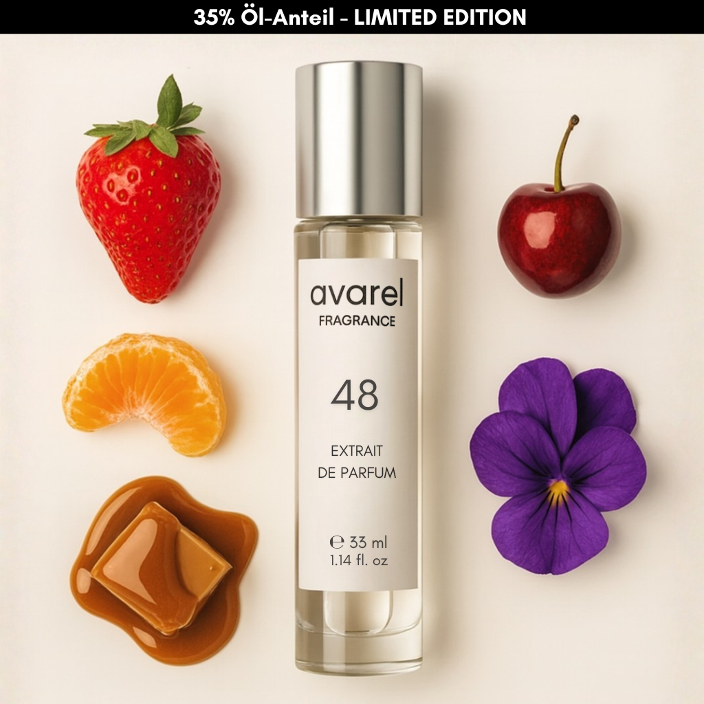 Miss 48 eröffnet mit einer strahlenden Frische: saftige Erdbeere trifft auf funkelnde Zitrusnuancen und zaubert einen fröhlich-leichten Auftakt voller jugendlicher Eleganz.